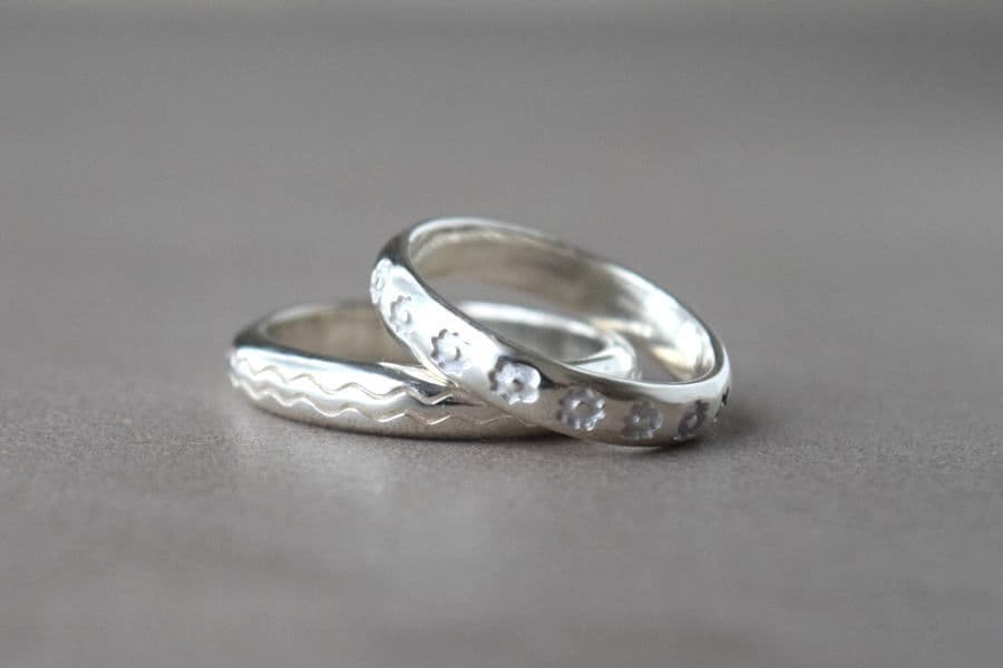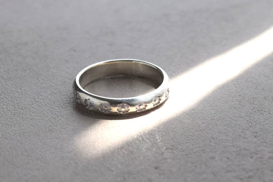スケッチフラワーリング 素材:シルバーサイズ:リング #14 こっそりガーリーな気分の日つるりとした甲丸リングに落書きのような緩めのお花を並べました。主張しすぎないお花の柄が、こっそり気分を上げてくれます。